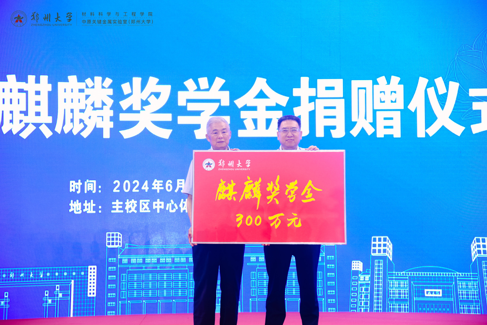 何季麟向鄭州大學捐贈300萬元設立“麒麟獎學金”。別榮海代表學校接受捐贈并向何季麟頒發捐贈證書。