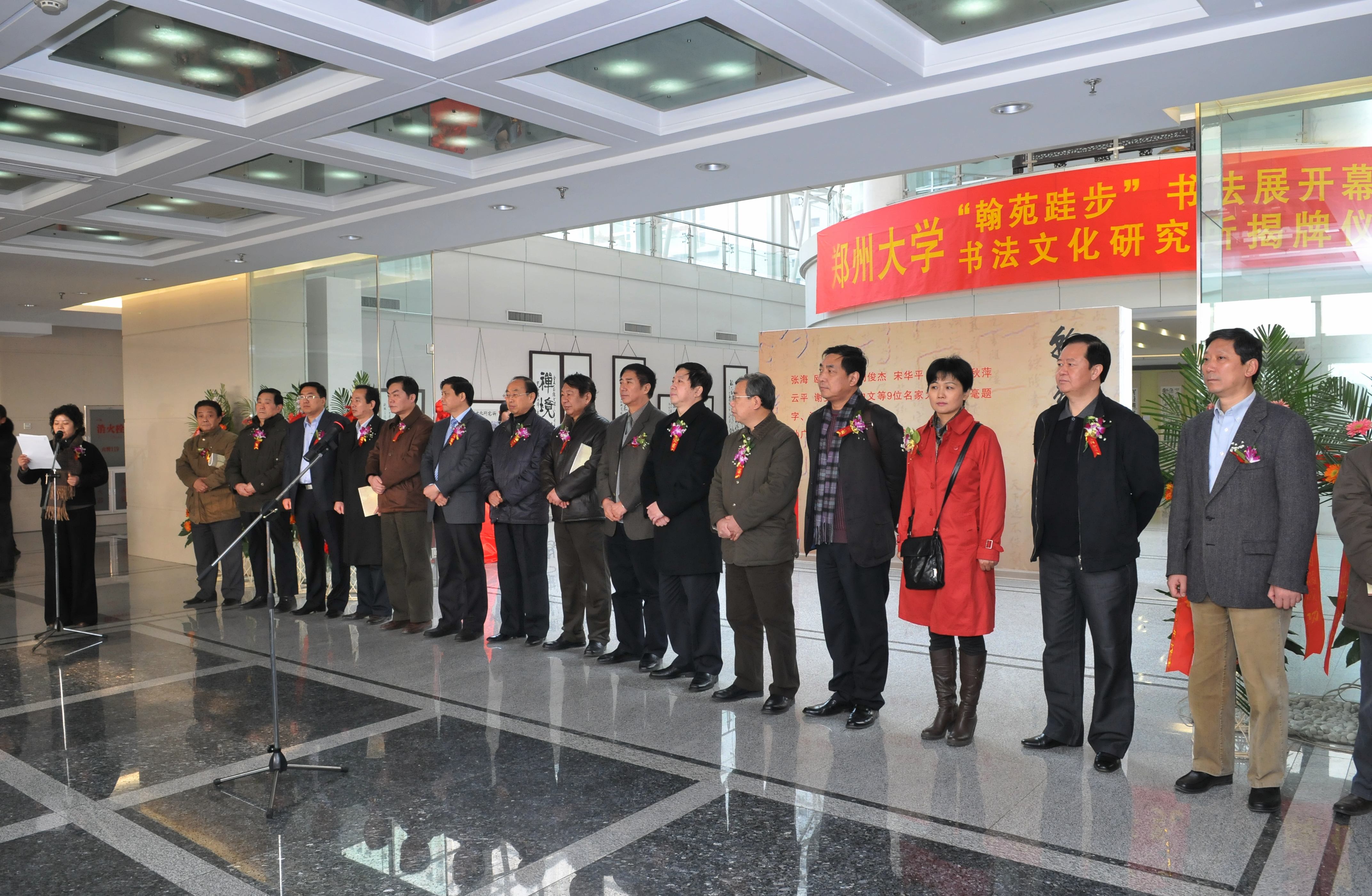 名家名作及“翰苑跬步”書法展開幕式暨鄭州大學書法文化研究所揭牌儀式12月23日上午在我校綜合管理中心舉行。河南省書法家協會主席宋華平,名譽主席周俊杰,副主席李強、胡秋萍、云平、謝安鈞,國內知名書畫家西中文、張同印、劉現寶、孔祥敬、谷景立、趙振乾,我校領導徐振魯、吳宏亮、宋毛平、別榮海出席了開幕式。