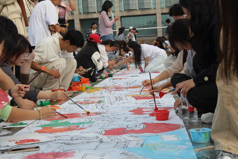 現(xiàn)場氣氛熱烈,色彩斑斕的顏料與充滿創(chuàng)意的畫筆交相輝映。畫卷兩側(cè)擠滿了鄭大青年積極參與的身影,或蹲或爬,用水粉、丙烯顏料等工具揮筆涂色,同學(xué)們專注而認真,爭相在畫卷上一展風(fēng)采,以真摯的情感、真實的視角和靈動的筆觸,勾勒出心中的祖國山河,鮮艷的牡丹、雄偉的長城、壯麗的天安門……每一幅經(jīng)典場面都展現(xiàn)著心中濃厚的愛國情懷。