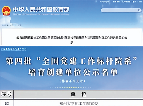化工學(xué)院黨委入選全國黨建工作標桿院系培育創(chuàng)建單位,學(xué)院榮獲2023年度河南省教育系統(tǒng)先進集體,化學(xué)工程與工藝系黨支部入選首批河南省高校樣板黨支部,制藥工程系黨支部和行政黨支部先后獲批河南省高校先進基層黨組織,博士生黨支部入選河南省黨建工作樣板支部,學(xué)生團支部獲評河南省五四紅旗團支部;學(xué)院師生先后榮獲河南省高等學(xué)校優(yōu)秀共產(chǎn)黨員、全國百名研究生黨員標兵、河南省教科文衛(wèi)體系統(tǒng)“工匠人才”、“師帶徒”標兵、“優(yōu)秀教師”、“出彩河南人”最美大學(xué)生、河南省百優(yōu)十佳“魅力團支書”等榮譽稱號。