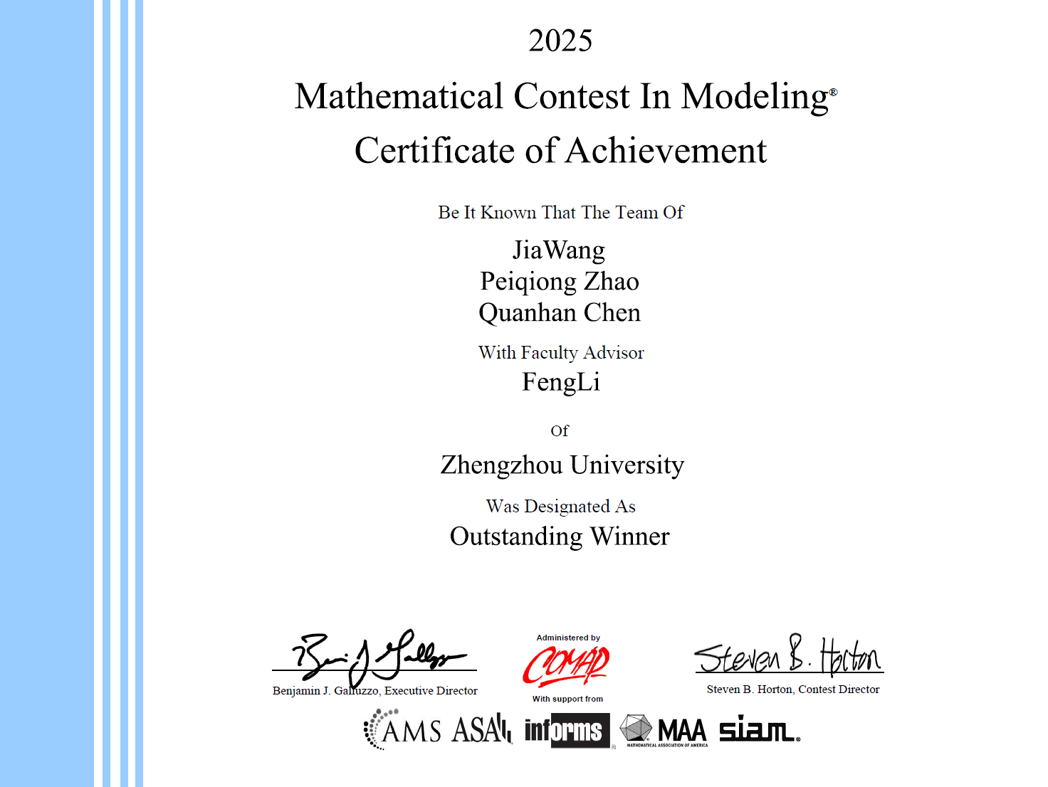 鄭大學子榮獲美國大學生數學建模競賽Outstanding Winner獎