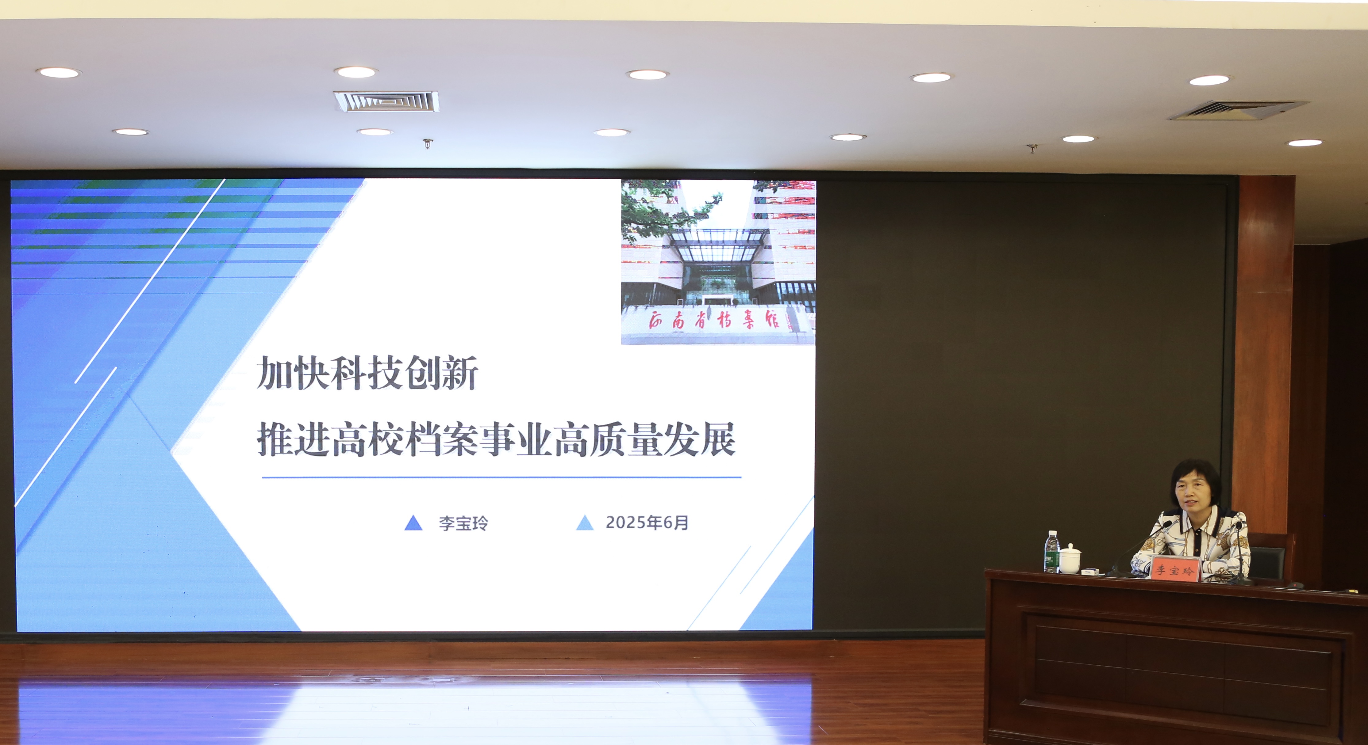 李寶玲以《加快科技創新推動高校檔案事業高質量發展》為題,從深刻認識科技創新對推進高校檔案事業高質量發展的重要意義、推進科技創新與檔案工作深度融合、以數字化轉型為抓手推進高校檔案事業高質量發展等方面為全校專兼職檔案員作了一場精彩的學術報告。她指出,以數據驅動流程重塑,通過數字檔案館建設、人工智能與大數據技術應用,推動檔案工作向“智能驅動”轉型,助力高校檔案事業高質量發展。