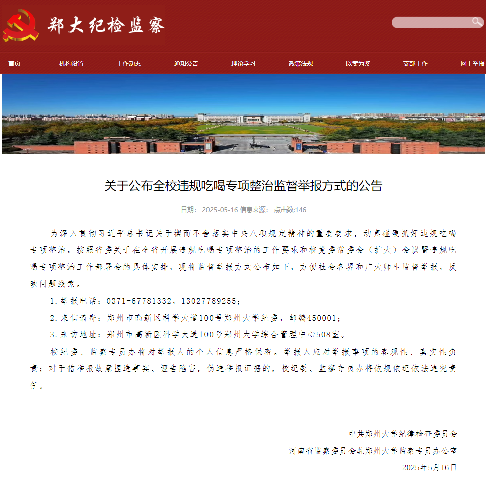 鄭州大學公布全校違規吃喝專項整治監督舉報方式