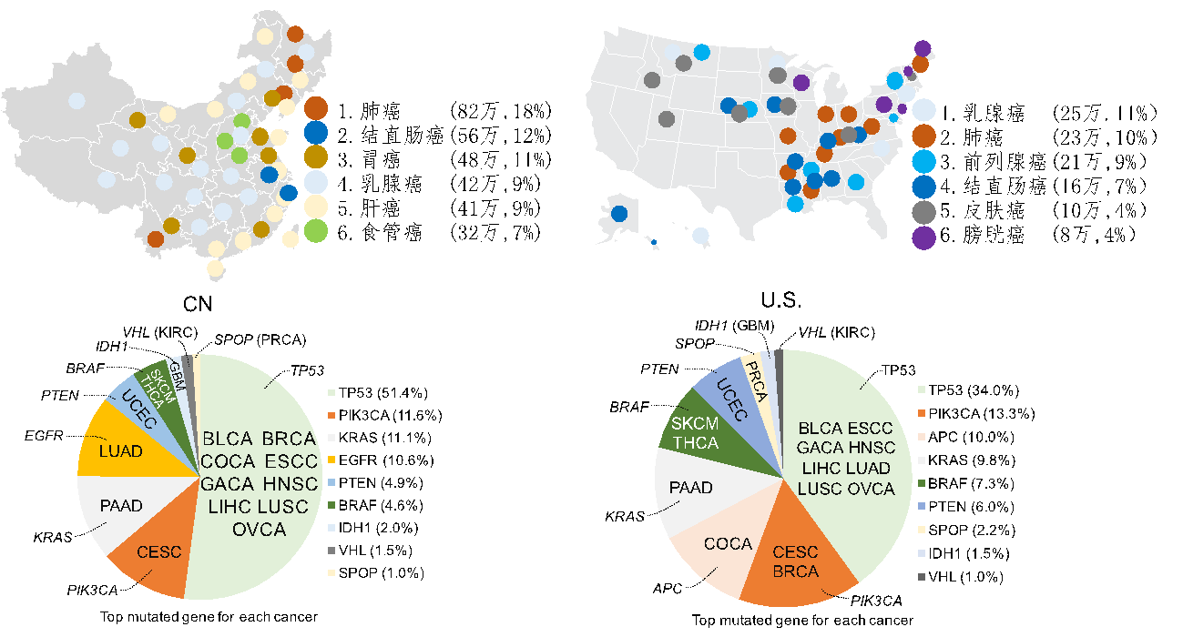 該研究收集并整理分析了2004年至2016年中國國家癌癥中心共556萬的癌癥流行病學數據。文中分析了23種癌癥類型(共包括94種腫瘤亞型,11,948例癌癥患者)中382個腫瘤相關基因中可影響編碼蛋白序列的基因突變。通過把腫瘤基因測序數據與流行病學數據進行融合分析,得出在中國癌癥人群中排名前十的突變基因為TP53 (51.4%),LRP1B(13.4%),PIK3CA (11.6%), KRAS (11.1%), EGFR (10.6%), APC (10.5%), KMT2D (9.7%), KMT2C (8.8%), ARID1A (8.4%), and FAT4 (7.7%)。其中在中國人群中突變頻率最高的基因為TP53 (51.4%),即超過一半的癌癥患者的腫瘤組織攜帶有TP53突變。通過對中國的突變頻率與美國的癌癥基因突變頻率進行對比分析發現,中國癌癥患者TP53 (51.4%) 及 EGFR (10.6%) 等癌癥基因的突變頻率要遠高于美國腫瘤患者的TP53 (34.0 %) 及 EGFR (3.1%)突變頻率。通過分析發現TP53的差異主要是來自于中國的非小細胞肺癌,胃癌,食管癌,及肝癌中TP53的高突變率。該研究通過性別及吸煙狀態的分層分析,發現EGFR的差異則主要來自于肺癌EGFR的高突變率,其中中國非吸煙女性的肺癌患者中EGFR的突變頻高達70.7%。