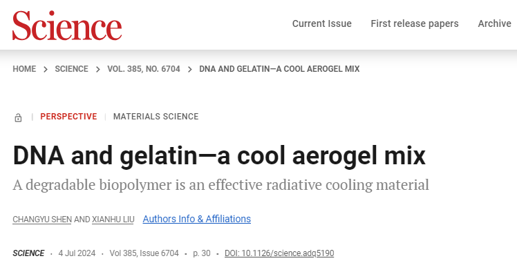 7月5日,鄭州大學橡塑模具國家工程研究中心申長雨院士和劉憲虎博士,在國際著名學術期刊《Science》發表了“DNA and gelatin—a cool aerogel mix”的觀點(Perspective)論文(Science, 2024, 385, 30)。結合近年來輻射制冷領域的新進展,文章對當期Ma等發表的Science論文“A photoluminescent hydrogen-bonded biomass aerogel for sustainable radiative cooling (Science, 2024, 385, 68)”研究工作進行了評述,并對可降解生物高分子輻射致冷材料進行了展望。鄭州大學是論文唯一通訊單位。