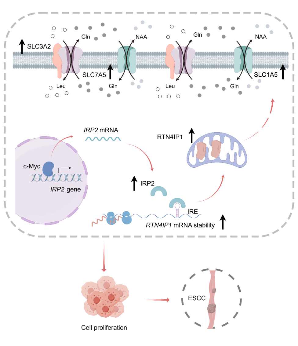 機制圖:c-Myc-IRP2介導的RTN4IP1高表達促進食管癌腫瘤細胞攝取外源氨基酸