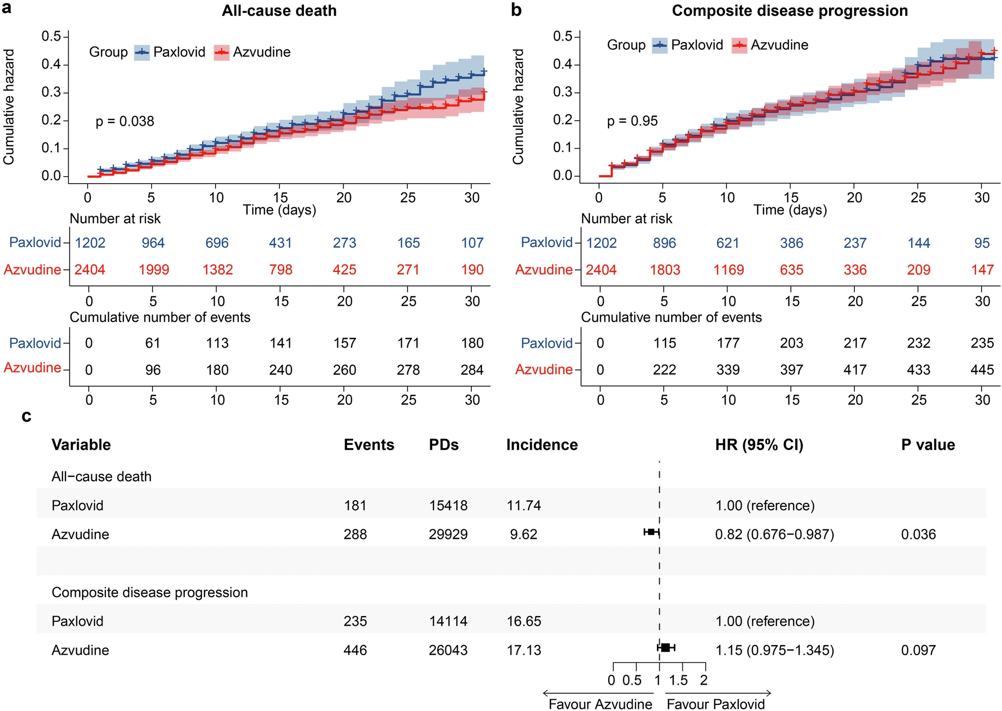以“Real-world effectiveness and safety of oral azvudine versus nirmatrelvir?ritonavir (Paxlovid) in hospitalized patients with COVID-19: a multicenter, retrospective, cohort study”為題的研究成果發表在Nature旗下頂尖期刊《Signal Transduction and Targeted Therapy》上。文章指出,奈瑪特韋/利托那韋(Paxlovid)作為國際公認的新冠治療藥物,已在多項臨床試驗和真實世界研究中證實療效,尤其是在降低住院率和死亡率方面表現突出。而Paxlovid的高成本、藥物相互作用(如與CYP3A代謝藥物的沖突)以及部分患者的不耐受性,限制了其廣泛應用。阿茲夫定片作為一種價格更低、使用更方便的藥物,與Paxlovid在有效性和安全性上相比如何呢?針對這一問題,余祖江教授團隊開展阿茲夫定片與Paxlovid治療新冠病毒感染的回顧性隊列研究。該研究覆蓋河南、新疆兩省11家醫院,共納入40876例患者。結果顯示:相比于Paxlovid組,阿茲夫定片組全因死亡風險顯著降低18%(P=0.036),復合疾病進展風險無顯著差異,且不良事件較少。亞組分析顯示,阿茲夫定片為惡性腫瘤患者提供了更大的益處,能顯著降低全因死亡風險(HR=0.33)和復合疾病進展風險(HR=0.54)。進一步通過體內外實驗證實阿茲夫定片可以通過調節CD4?T和CD8?T細胞來抑制肝細胞癌生長。鄭州大學余祖江教授、任志剛主任醫師與??嗽菏繛橥ㄓ嵶髡撸鹾S畈┦可?、崔光瑩副主任醫師、程銘高級工程師、新疆醫科大學一附院吐爾干艾力·阿吉教授、洛陽市中心醫院李國濤主任醫師為共同第一作者。