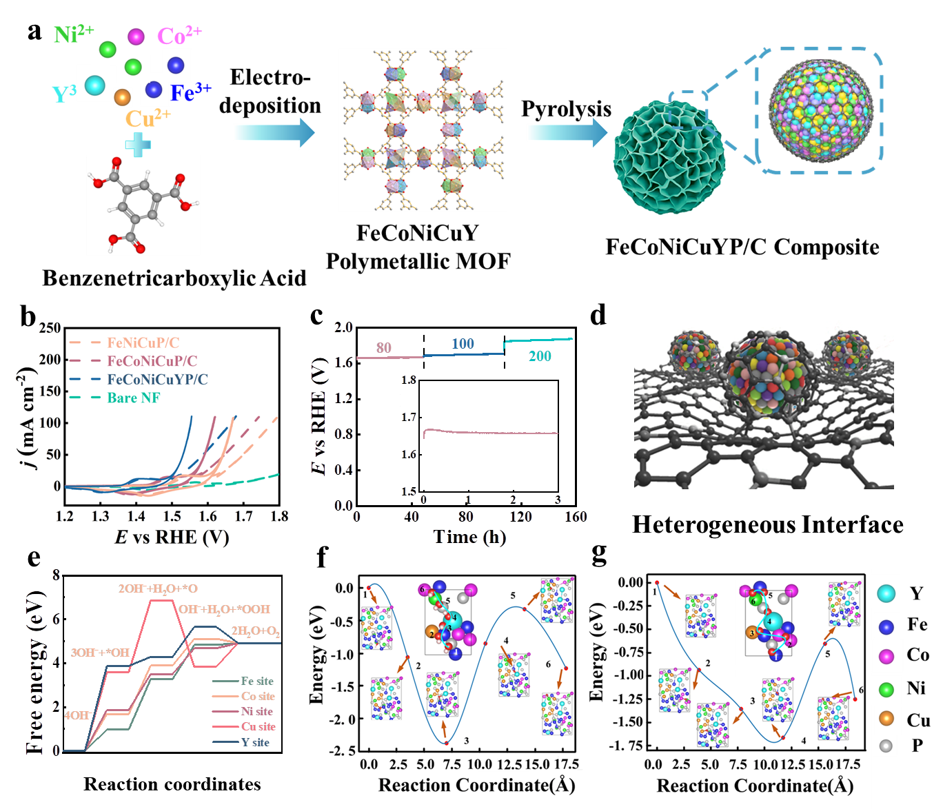 該工作采用電沉積方法合成了包含Fe、Ni、Co、Cu和Y金屬元素的高熵金屬有機框架,以此為模板,合成了具有多種催化活性位點的高熵磷化物/碳(FeCoNiCuYP/C)復合催化劑。研究表明,Cu/Y和Fe原子之間的補償電子結構,可以優化催化劑與中間體的結合強度。Fe和Ni/Co位點分別傾向于穩定HO*和HOO*中間體,有利于打破其在OER過程中的吉布斯自由能制約關系。FeCoNiCuYP/C電催化劑表現出優異的OER性能和優異的穩定性。該項工作為設計高效高熵電催化劑提供了一條創新途徑,對前沿電催化應用具有重要意義。