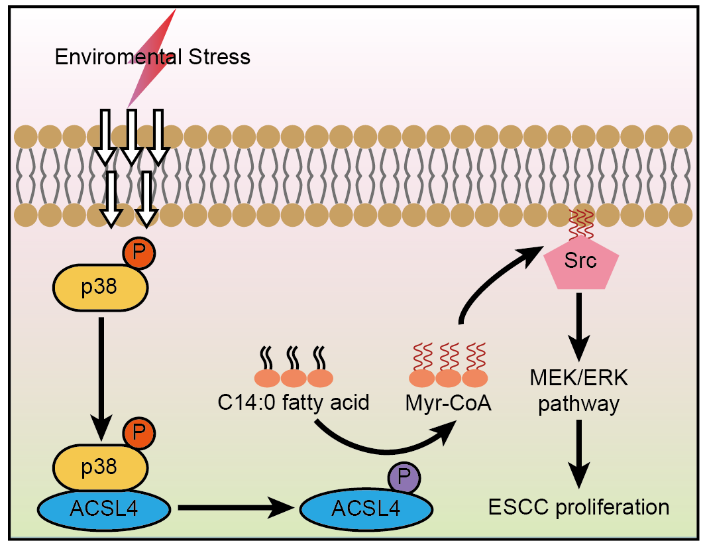 持續的外部刺激已被認為是從癌前病變發展為癌癥的重要致病因素,特別是在消化系統腫瘤的發生過程中。課題組前期研究顯示,p38MAPK應激通路在食管癌進展過程中活化。然而在癌前病變向食管癌演變的過程中,外界刺激引起應激途徑的激活是否直接導致細胞內增殖通路的活化,進而促進腫瘤發生發展尚不清楚。本研究揭示ACSL4在食管鱗癌組織中高表達且與患者的不良預后相關,同時闡明ACSL4作為長鏈脂酰輔酶a合成酶家族的重要成員,其T679位點可被p38磷酸化,從而增強其酶活性,導致C14:0 CoA的產生增加,從而促進Src激酶的肉豆酰化并激活下游分子ERK。該研究團隊也利用小鼠原位食管癌的誘導模型,在體內實驗證實ACSL4介導的上述機制。首次闡明了ACSL4在介導應激誘導激活增殖相關級聯反應并促進腫瘤發生的機制,為食管癌的防治提供新的理論依據。