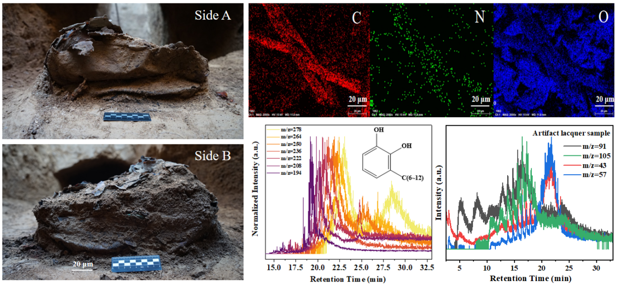 該工作以河南焦作唐代墓葬出土的一件劣化嚴重的漆皮文物為對象,綜合運用掃描電鏡—能譜分析(SEM-EDS)與熱裂解氣相色譜—質譜(Py-GC-MS)等技術,系統揭示了該文物的組成、結構、形貌與降解特征。結果表明,該文物為皮革基層結合天然生漆涂飾的漆皮制品,其漆膜雖已發生顯著劣化,但仍保留源自中國傳統漆樹的典型化學結構特征。通過與現代生漆樣本的對比分析,進一步確認該文物材料的原始來源與劣化程度。研究構建了“形貌—成分—結構—來源”多維識別體系,為文化遺產中復雜有機質文物的材料鑒定與工藝復原提供了新的技術路徑,也有望為唐代漆皮制作工藝的歷史重構與科學保護提高必要的理論參考。
