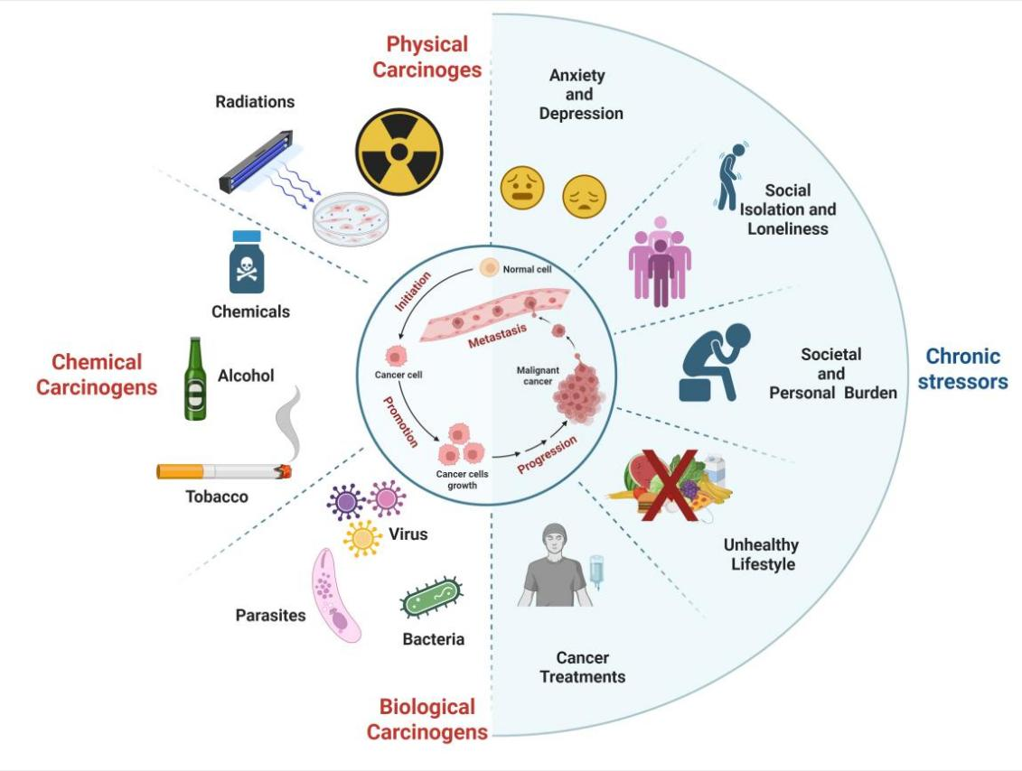 目前公認的癌癥病因有三大類,物理、化學和生物致癌因素。物理致癌物包括電離輻射(IR)、紫外線(UV)輻射和其他形式的物理制劑;化學致癌物是直接誘導DNA損傷的化學制劑,如煙草、石棉、黃曲霉毒素、亞硝酸鹽等;生物致癌物有HPV、EBV以及幽門螺桿菌(H.pylori)感染等。然而,這些致癌因素都是外源性的,宿主本身,特別是長期的慢性心理壓力在癌癥發生發展中的作用被長期忽視,尤其是在現代快節奏的生活和工作壓力下,慢性壓力和相關的負面情緒在癌癥的研究中被高度重視。