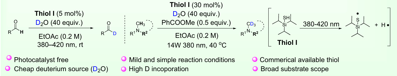 近日,鄭州大學基礎醫學院青年教師張月騰與河南先進技術研究院王志遠副教授在光催化氘代領域取得新進展。該研究突破性地開發出一種無需昂貴光催化劑(PC-free),僅利用380-420nm光照和市售常見硫醇化合物即可實現高效氘代標記的新方法。該方法成功應用于有機分子中甲酰基和胺α-位的高效選擇性氘代,氘代率最高可達98%。該合成方法的成功實施不僅大幅降低了氘標記化合物的合成成本和操作復雜性,還揭示了一種此前未被認識的光活化反應機制,為綠色經濟的氫同位素標記和光催化化學合成提供了新的視角。