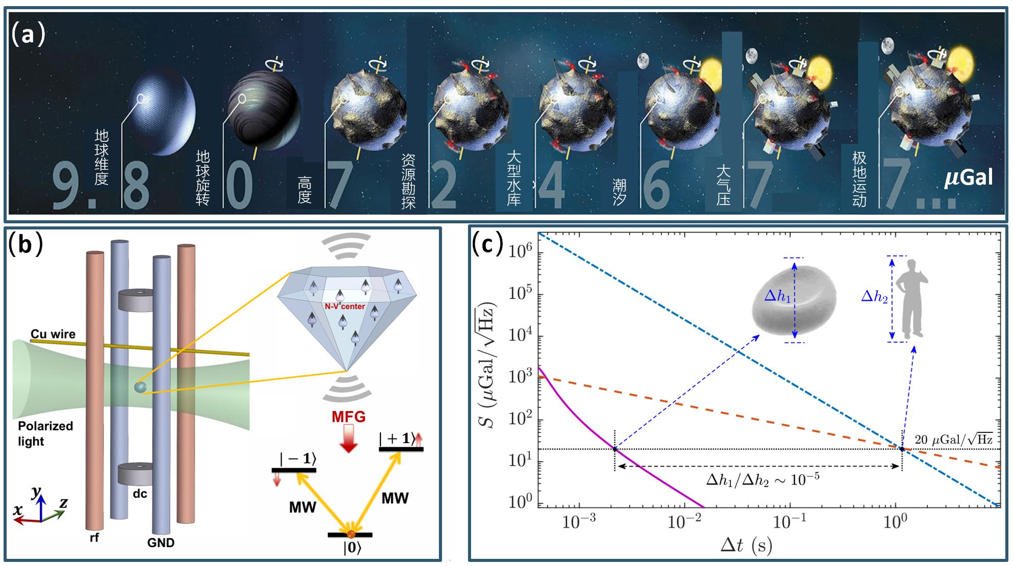 圖(a)重力測量在不同精度下的應用(ESA medialab, ESA communication production SP-1314);(b)利用離子阱囚禁單個納米金剛石顆粒構建重力儀的方案;(c)重力傳感靈敏度:相同傳感精度下,該方案的干涉尺寸比傳統方案縮小約5個量級