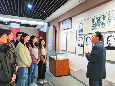 4月21日,鄭州大學歷史學院黨委副書記崔紅偉,在該校校史館給同學們講首任校長嵇文甫的紅色故事。 馬文亞 攝