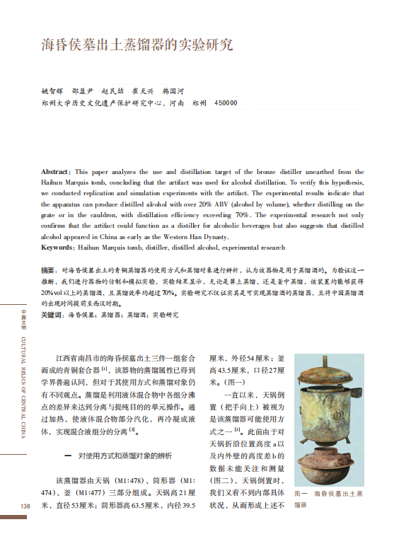 記者從鄭州大學歷史文化遺產保護研究中心獲悉,日前,該中心研究團隊在前期研究的基礎上,首次對海昏侯墓出土的蒸餾器進行仿制和模擬實驗,證實其確實具有蒸餾酒的功用。這將中國蒸餾酒的技術實現可能性上推千年。