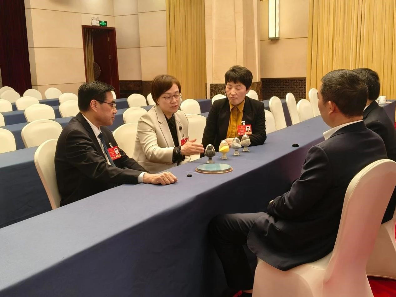 裝著金屬粉末的雞心瓶、好似飛碟的金屬圓盤,醒目地擺放在河南代表團小組討論桌上。圍坐四周的是全國人大代表、鄭州大學校長、中國科學院院士李蓬(中),全國人大代表、河南省三門峽市委書記范付中(左)和另外3名代表,剛剛參加完小組討論的他們意猶未盡,還在圍繞“無氨氮鉬冶金新技術”熱烈地討論著。
