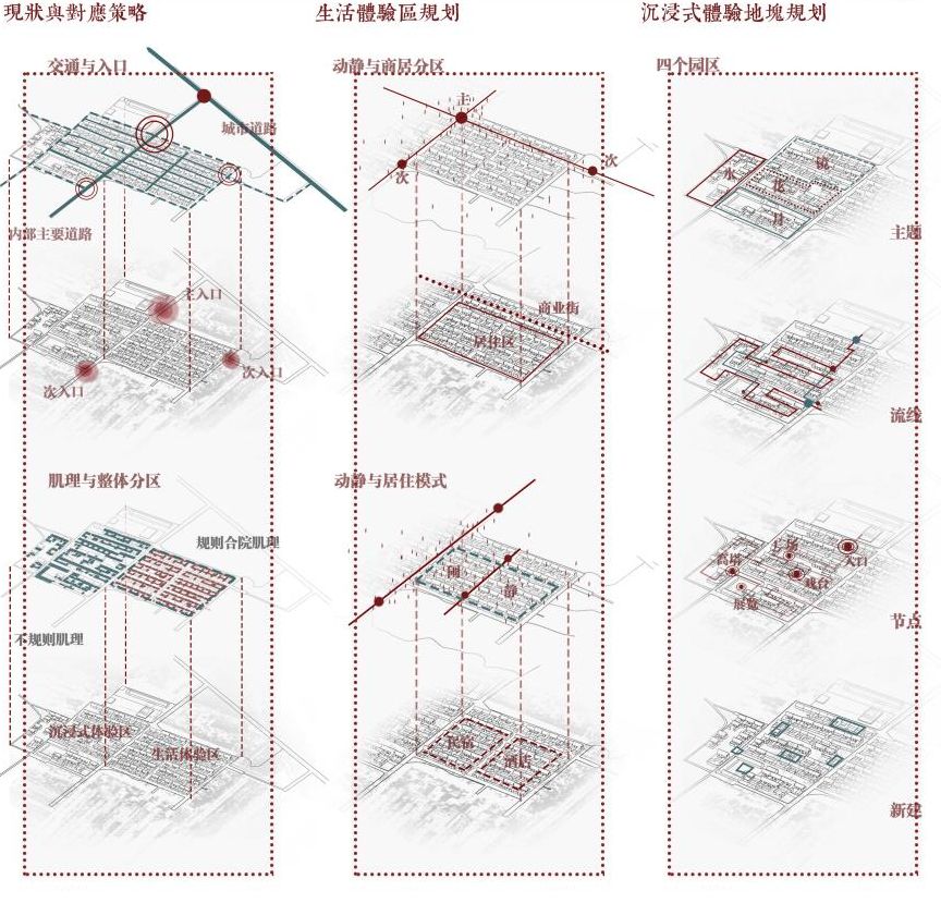 在老師的帶領下,團隊設計逐漸步入正軌。在如何提高園區的趣味性、更好地吸引游客這一問題上,陳琛建議她們多聯系生活中的流行藝術。這一建議啟發她們想起了“沉浸式戲劇”這一時下新興的表演方式,并最終選擇這一理念作為設計核心。她們梳理了小西村的資源優勢,集中體現在漁、海、市、海草房四個方面,接著嘗試用文、游、戲、商四種方式對資源進行整合,同時根據現有布局和容量大小重新劃分功能區,分為沉浸式體驗區和住宅區兩大部分。