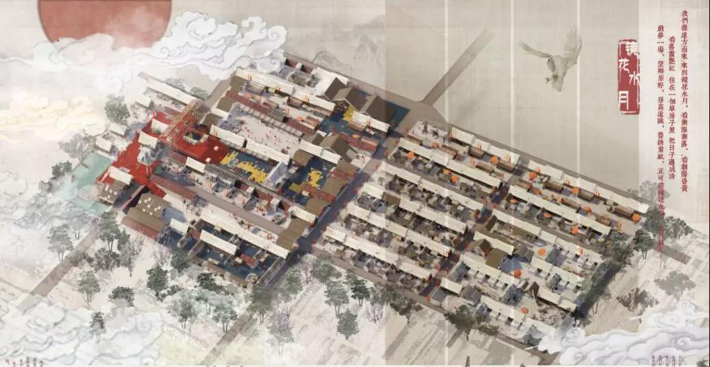 團隊在規劃的沉浸式體驗區內設置了“鏡”“花”“水”“月”四個園區,以沉浸式劇場為空間要素,融入原創故事情節,為游客提供“入鏡——花戲——水鄉——月苑”四重空間體驗。