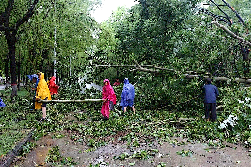 優(yōu)美整潔的校園環(huán)境一度讓鄭州大學(xué)美譽有加,但是在暴雨的沖刷下,四校區(qū)松樹、柳樹等一百余棵樹木倒伏,大量淤泥堵塞道路,大樹橫于路中,嚴(yán)重影響交通安全。為使校園環(huán)境盡快恢復(fù)正常,道路暢通方便通行,校園環(huán)境服務(wù)中心和師生生活服務(wù)公司第一時間組織人員冒雨對影響道路出行的樹木進(jìn)行處理,僅主校區(qū)就有134人保潔人員出動。