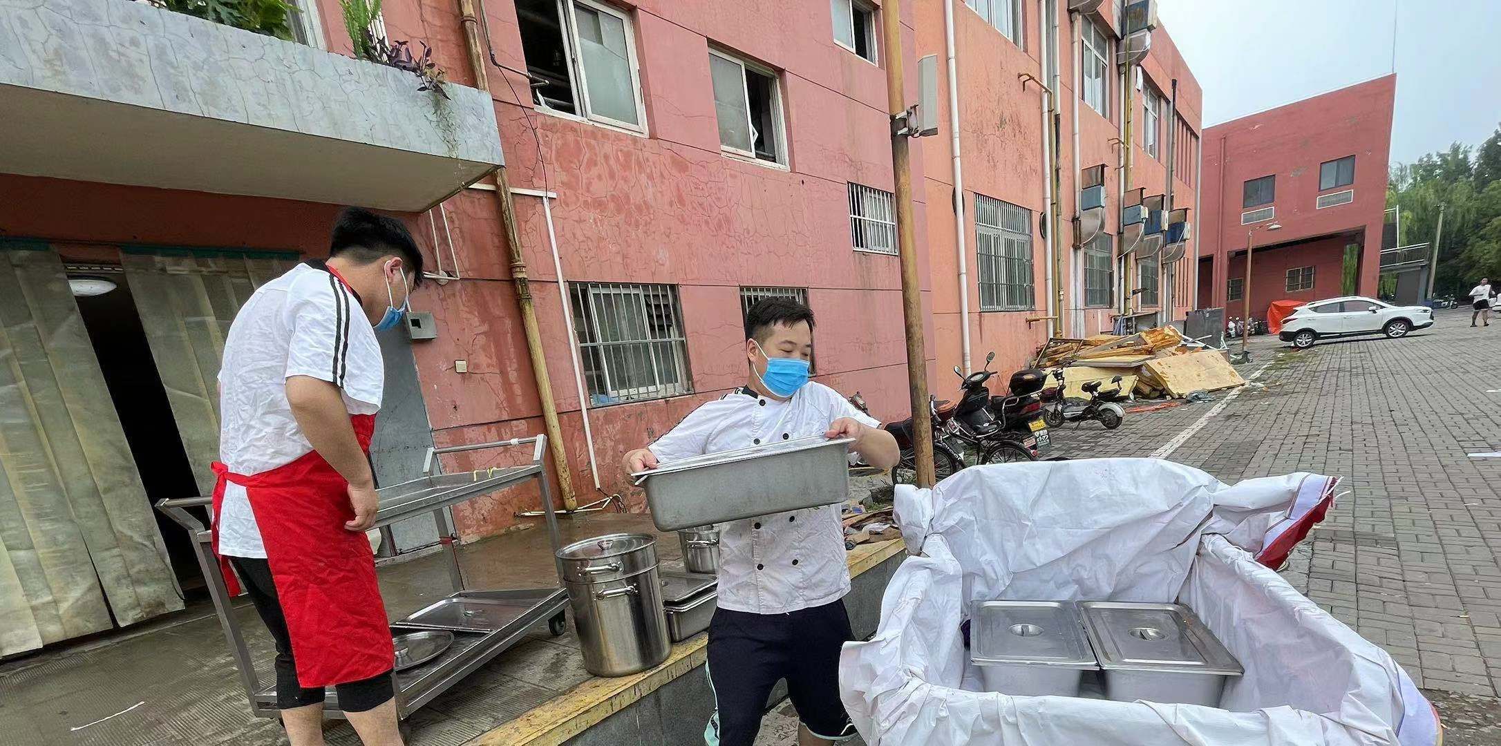 學(xué)校正處于小學(xué)期,主校區(qū)在校生有1.2萬人,洪水之下停水停電,如何讓學(xué)生們吃上熱氣騰騰的飯菜?這成為飲食部門急需破解的重點難點問題。據(jù)后勤集團(tuán)飲食部門的負(fù)責(zé)人王雷介紹,菊園地勢低、積水深,餐廳進(jìn)水嚴(yán)重。當(dāng)時沒有備用的防汛袋,員工只能用米和面粉進(jìn)行圍堵,但水還是止不住從下水道翻出來。食堂的高壓電已經(jīng)斷開,王雷交代員工關(guān)閉所有的閥門,包括燃?xì)忾y、水閥、電閥,以防止發(fā)生意外。隨后員工們一起將絞肉機等小型機器搬至較高的地方。水勢較猛,一些冰箱、冰柜等大型機器在水進(jìn)來時被沖倒,王雷說:“即使扶起來,里面的壓縮機也可能無法工作。”