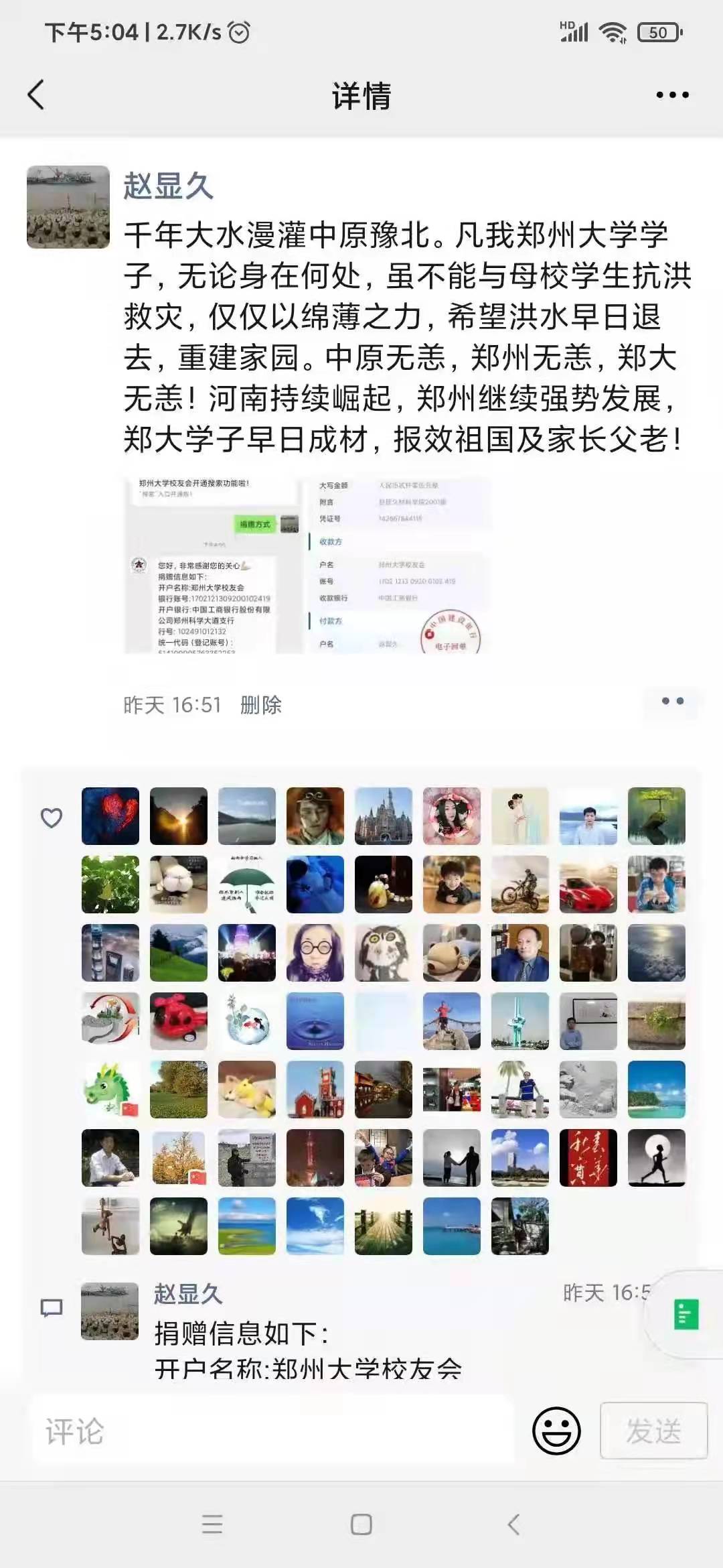 “千年大水漫灌中原豫北。凡我鄭州大學學子,無論身處何處,雖不能與母校學生抗洪救災,僅以綿薄之力,希望洪水早日褪去,重建家園!”這句令人潸然淚下的號召來自材料科學與工程學院2001級校友趙顯久的朋友圈。僅兩天時間,材料科學與工程學院2001級校友便籌得人民幣21642.66元。無獨有偶,災情發生后,各個學院、各年級的校友一呼百應,積極主動為母校募捐。浙江校友會中不愿意留下姓名的校友、福建校友會(籌)中愛心接力的父子二人、江蘇校友會(籌)微信群里的捐贈接龍……風雨面前,每一份愛心的匯聚,都為鄭州大學帶來雨后的陽光。