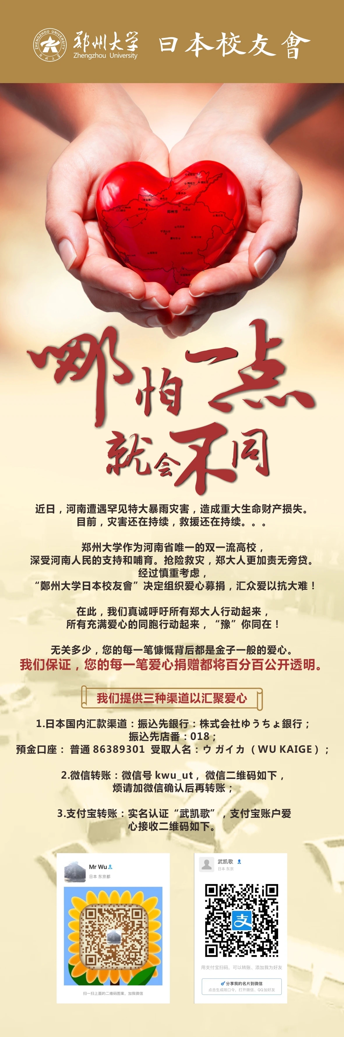 使人感動的不僅僅有鄭大校友,還有眾多來自社會各界的愛心人士。華盛頓校友會收到了一位七十多歲老先生的捐款,老先生看到新聞后,主動找到華盛頓校友會捐贈1000多美元,他說:“我雖然不是河南人,也沒有在鄭州大學讀過書,但是我特別喜歡河南這個地方。”遠在日本的材料科學與工程學院2006級校友武凱歌看到新聞后焦慮萬分,他想“一定要做點什么,哪怕一點點兒,就會不同!”他率先提出為家鄉、為母校捐款的提議,日本校友會(籌)負責人迅速響應,立即啟動募捐籌劃。臺灣高雄大學法學院楊戊龍教授在了解鄭州災情之后,很是掛念,“作為老師的本能,想到可能有學生需要幫助。”于是,他主動聯系到我校法學院鄭磊老師,向鄭州大學捐款10000元,希望幫助鄭大學子渡過難關。
