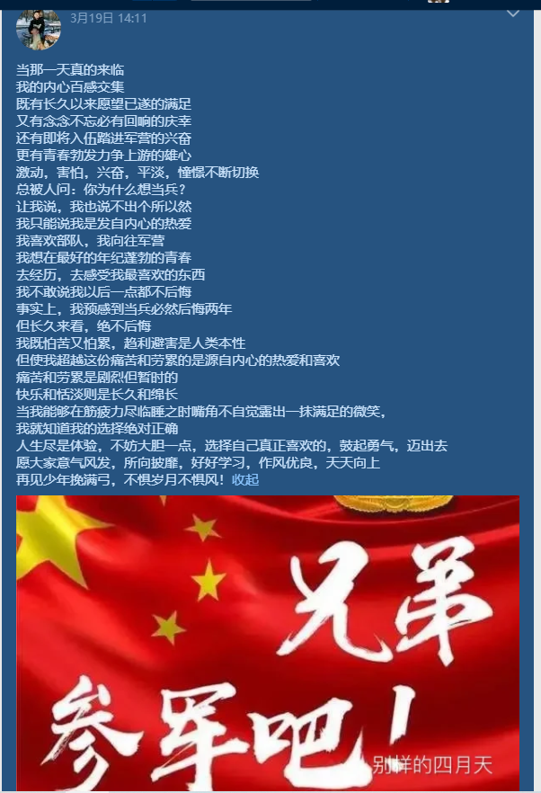 “為了參軍,我近一年跑了800km。我是多么想從軍,從小到大,我從未有過如此強烈的愿望!命運為什么要捉弄我呢?一起體檢、抱著碰碰運氣心態(tài)的伙伴都順利通過了,偏偏我不能如愿,無力感裹挾著我,真的難受。現(xiàn)在明知道體檢沒通過,當兵的愿望反而比體檢前更強烈,難道是天將降大任于斯人也,必先苦其心志,勞其筋骨,餓其體膚,空乏其身,行拂亂其所為嗎?”