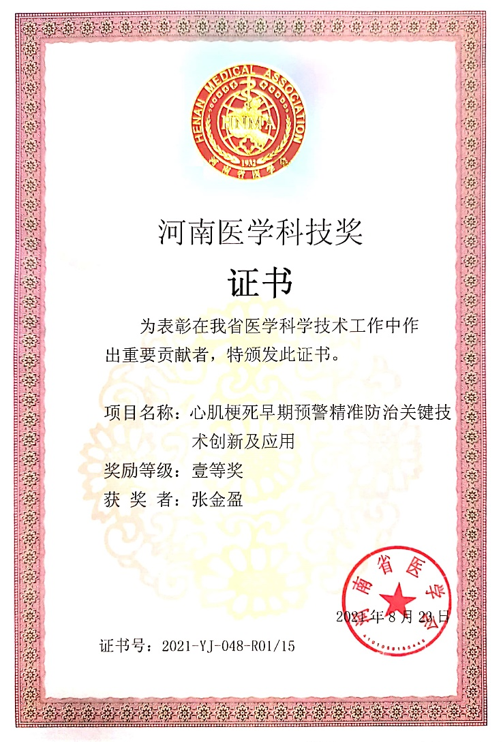 3月22日,河南省人民政府公布“關于2021年度河南省科學技術獎勵的決定”,鄭州大學一附院張金盈教授團隊“心肌梗死早期預警精準防治關鍵技術創新及應用”項目赫然在列,榮獲2021年度河南省科學技術進步獎一等獎。