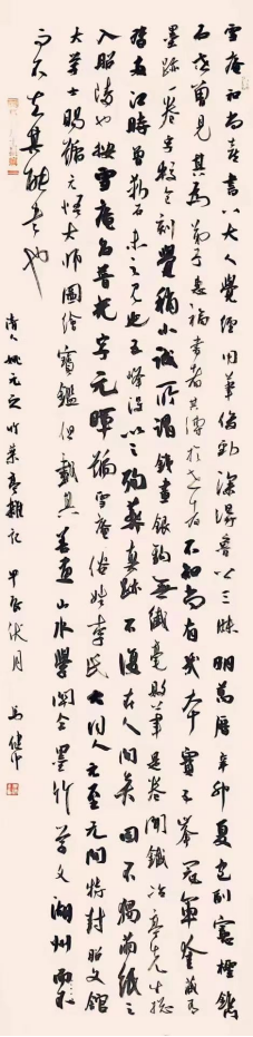 “馬健中教授在碑學(xué)與帖學(xué)的審美映照下,熔鑄文人性情;以魏晉風(fēng)度驅(qū)馳翰逸神飛,以金石之音落筆化形;故而,在筆墨輕盈灑脫,帖學(xué)風(fēng)味醇厚中,又蘊(yùn)蓄一種渾厚蒼茫之力。點(diǎn)畫(huà)清真,有奔雷墜石之奇;儀態(tài)蕭然,有絕岸頹峰之勢(shì);郁郁纖纖,一種書(shū)卷之氣,充盈筆墨之間,展疏狂文人之不拘性情?!彼膶?dǎo)師著名書(shū)法家孟云飛對(duì)馬健中高度評(píng)價(jià)。