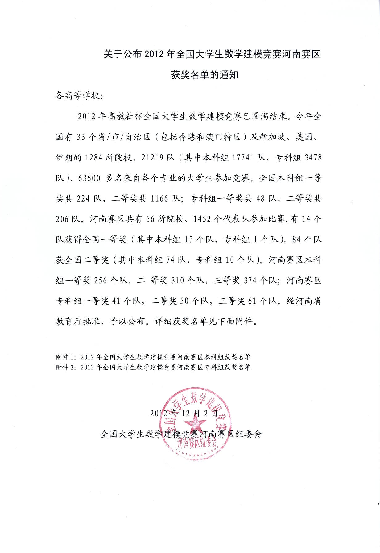 關于公布2012年全國大學生數學建模競賽河南賽區獲獎名單的通知