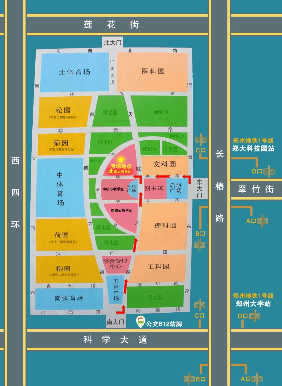 路線1(最佳路線):乘坐地鐵1號線到鄭大科技園站下車,從B口或C口出站,由鄭州大學東大門進入,然后右轉沿毓秀路直行至天健大道交叉口,繼續直行向西即到北核心教學區。