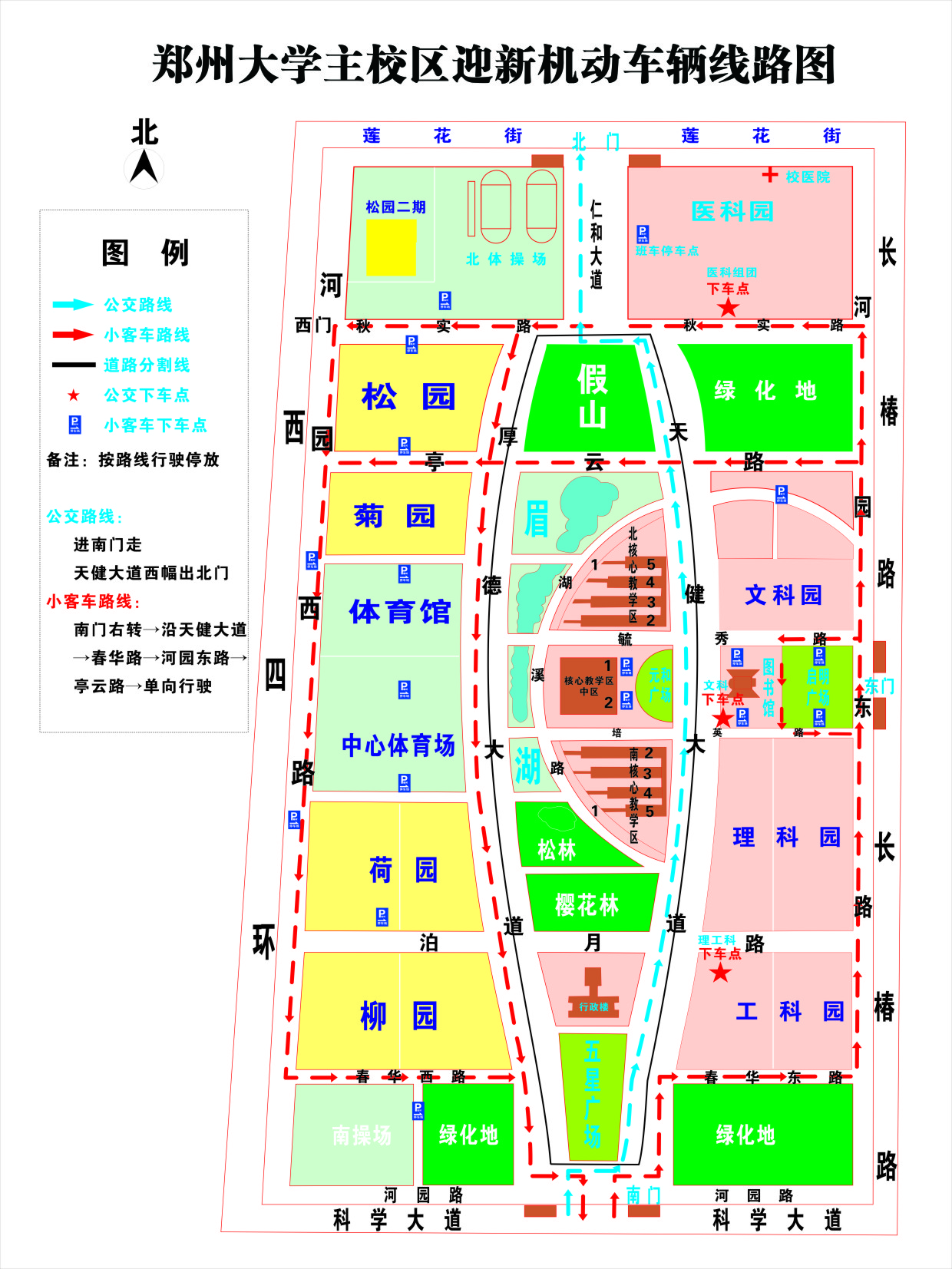 (五)醫科新生車輛:在醫學組團廣場下車,到院(系)辦理完報到手續后,車輛沿秋實路、河園西路到學生宿舍區。