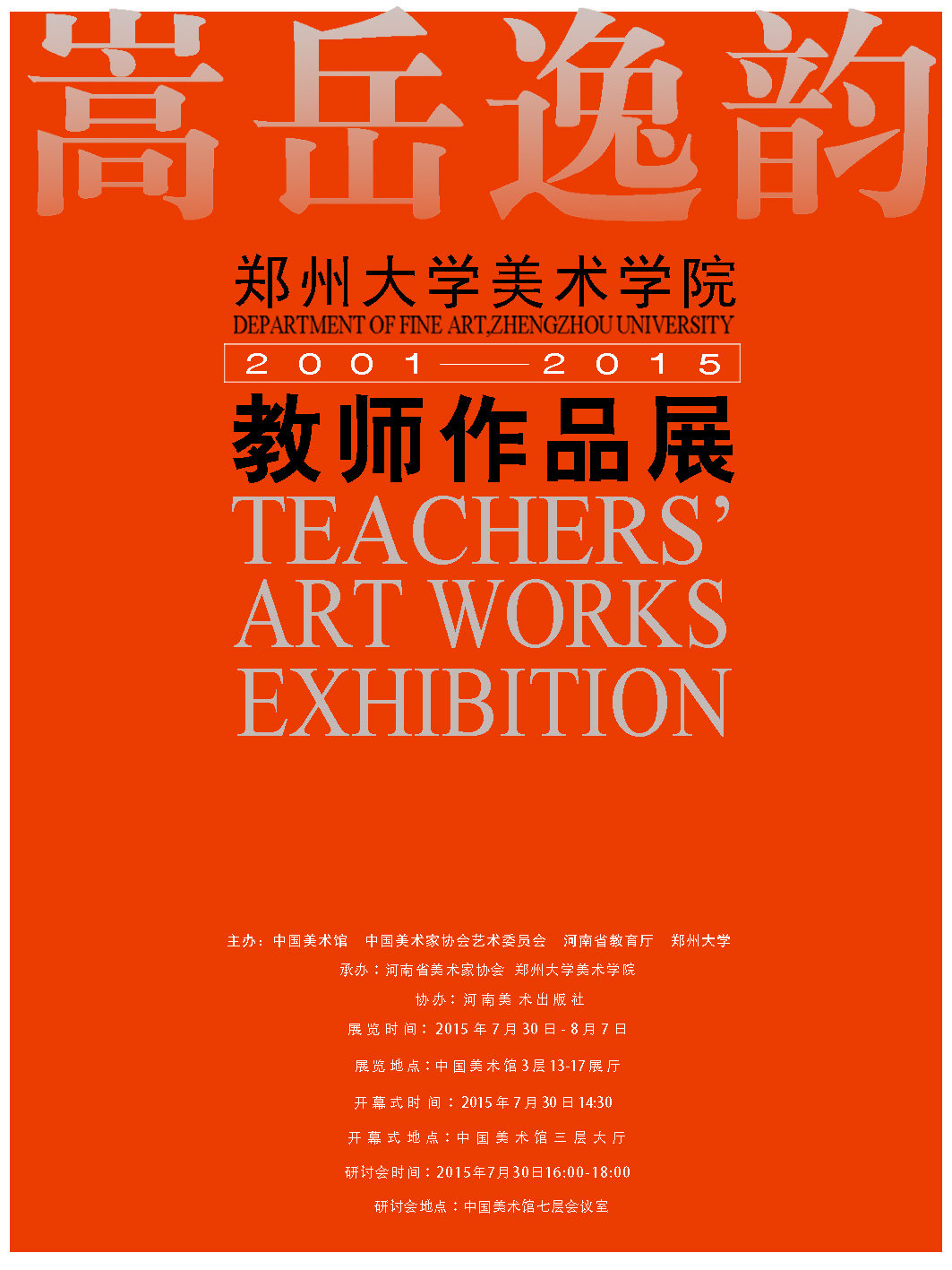 為了展示和傳播鄭州大學美術學院教師團隊積聚15載的藝術成果,提升美術學院的對外影響力,由中國美術館、中國美術家協會藝委會、河南省教育廳、鄭州大學等單位聯袂主辦,河南省美術家協會、鄭州大學美術學院承辦的“嵩岳逸韻——鄭州大學美術學院教師作品展”將于2015年7月30日下午2:30分在北京中國美術館舉辦開幕式,并于當日下午4:00——6:00在中國美術館7樓舉辦學術研討會。本次展覽將展出美術學院師生歷年創作的精品150余件,包括國畫、油畫、雕塑、書法、設計、動畫等畫種。