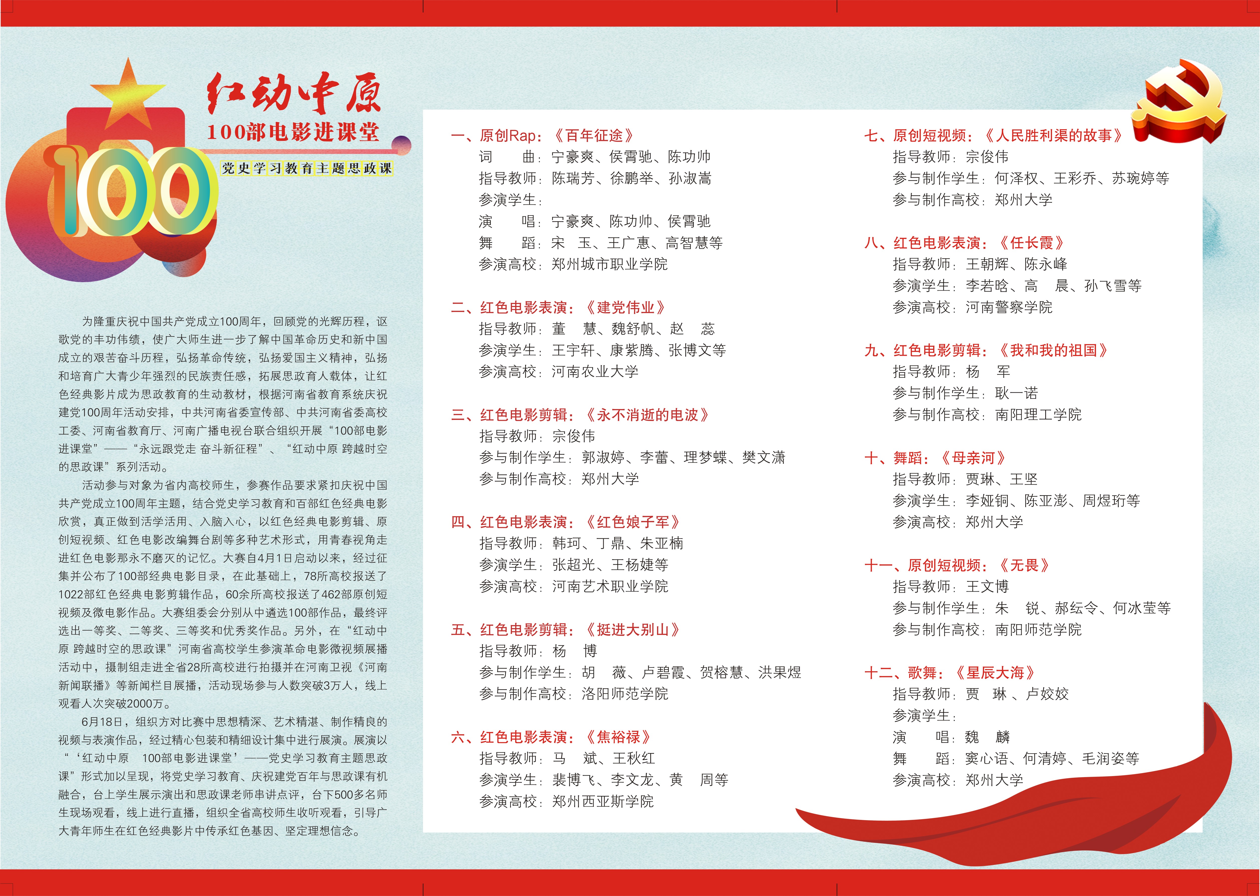 為慶祝中國共產(chǎn)黨成立100周年,推動(dòng)黨史學(xué)習(xí)教育入腦入心,拓展思政育人載體,由省委宣傳部、省委高校工委、省教育廳、河南廣播電視臺(tái)主辦,鄭州大學(xué)等單位承辦的“紅動(dòng)中原·100部電影進(jìn)課堂”黨史學(xué)習(xí)教育主題思政課將于今晚(6月18日)19:00-21:00在南校區(qū)學(xué)習(xí)堂舉行。
