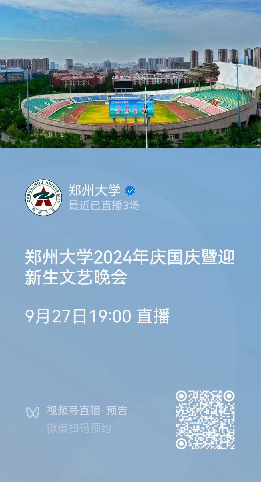鄭州大學2024年慶國慶暨迎新生文藝晚會將于9月27日19:00-21:00,在主校區本源體育場舉辦。晚會將同步進行網上直播,歡迎廣大師生、校友、學生家長及社會各界在線觀看。
