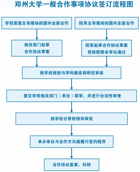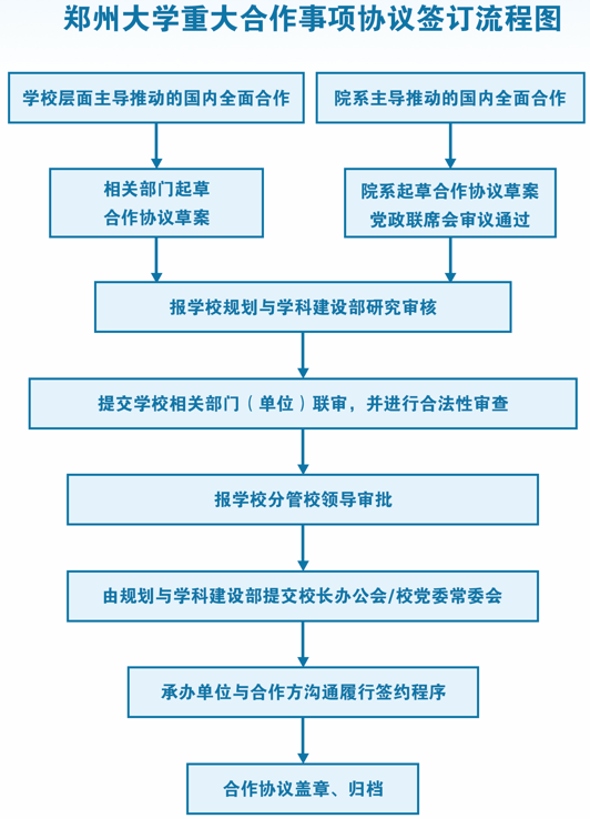國內全面合作是以鄭州大學為一方當事人,與政府(含下屬廳、局、委)、國內高校、科研院所等開展的,需要學校層面整體推動落實的全面性、綜合性合作,不包括由一個校內單位對接落實的單一領域的合作。